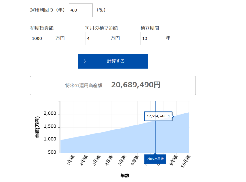 これはちょっと脱線ですが、もし外貨建て保険の1千万を原資として、変額保険の保険料月約4万円を年利4%で運用した場合どうなるかシミュレーションしてみました。