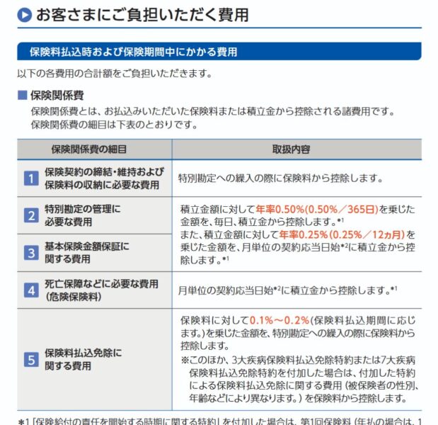 たとえば、書類には、保険料や積立金から各種費用が差し引かれることが書かれています。